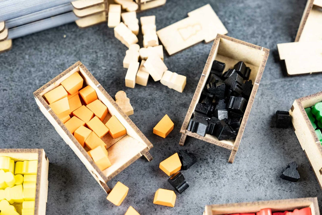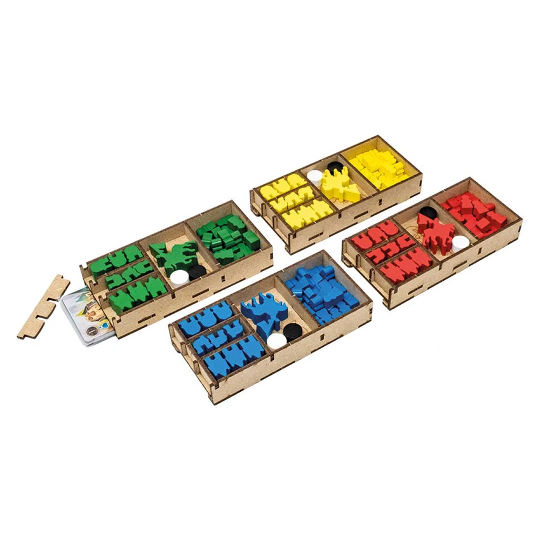 - 4x player set trays, with slots for each piece and cards;