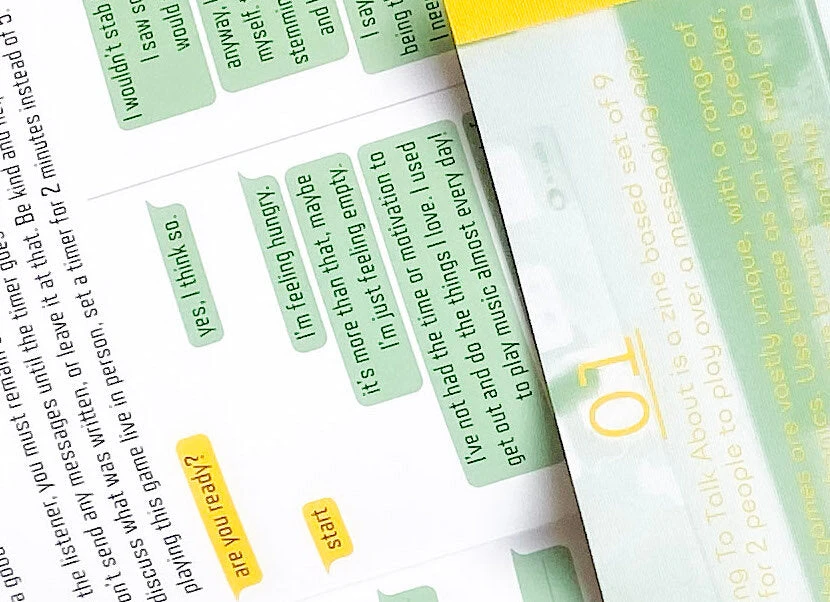 Nothing To Talk About is a zine with 9 games for 2 people to play over any messaging app. All of the games are vastly unique, with a range of styles and mechanics. Use these as an ice breaker, a stress reliever, a creative brainstorming tool, or a way to explore a relationship! Each game encourages play through a ritualized setting. One simply needs to send a photo of a single page of rules to someone on the other end of their phone, and the game begins!