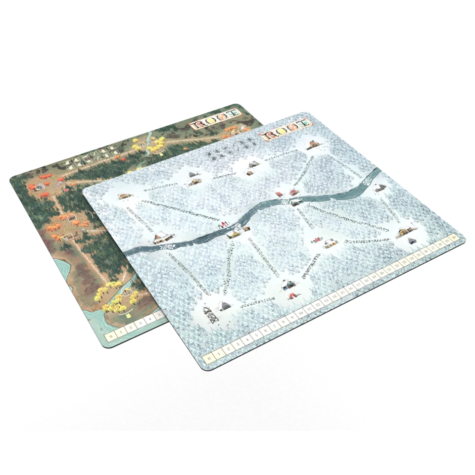 A deluxe double-sided neoprene playmat of the fall and winter gameboards from the Root base game. Measures approximately 22″ x 22″.