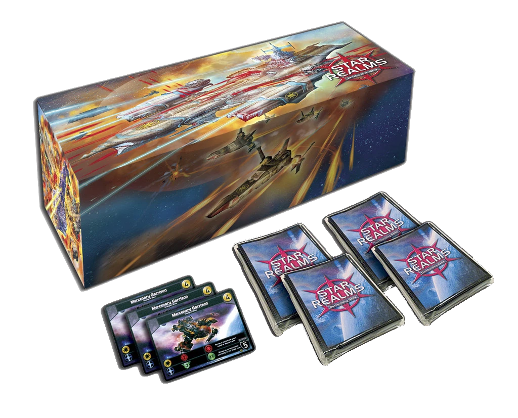Star Realms themed artwork, “400” count box. Comes with 3 promos, 4 dividers, and 224 sleeves.