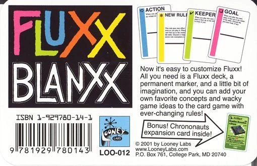 [Bonus! Chrononauts expansion card inside!]Note: The current edition of Fluxx Blanxx has one of each type of card (including the Creeper but not the Ungoal) and it does not have the bonus Chrononauts card.
