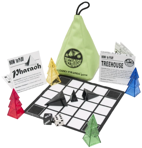 Treehouse is a simple-yet-challenging Icehouse game that comes with 15 Icehouse pyramids, with three pyramids each in five different colors. A special D6 gives each player the option to Aim, Hop, Tip, Swap or Dig each turn, with the player trying to rearrange his initial “tree” of pyramids to match the three in the “House”, which serves as the goal for all players.