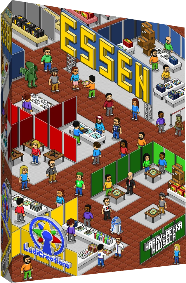 In ESSEN, players are exhibitors who are trying to sell their games at a large board game fair in the well-known western German city of Essen. By placing their sellers, creating buzz, and managing their promotional efforts correctly, they can turn a profit and get board game geeks excited about their games. Each player board is themed as a certain type of game publisher (eurogames, ameritrash, war games, RPGs) with the reverse side showing other possibilities (abstract, children’s games, party games, LARP).
