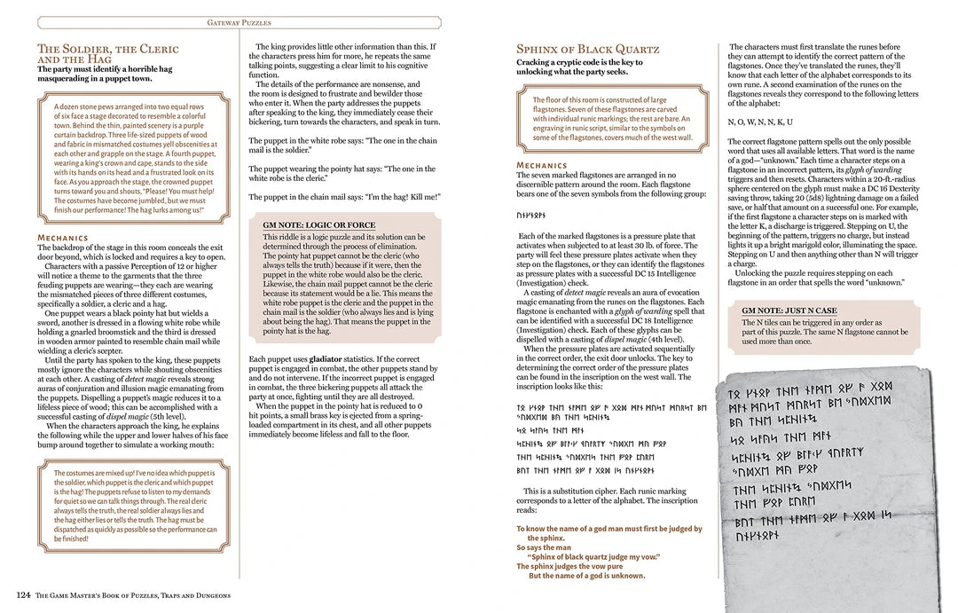 The Game Master’s Book of Traps, Puzzles and Dungeons provides GMs with endless options for populating their adventures with challenging riddles, puzzles, spiked pits, Rube Goldberg-style deathtraps and much more – eveything they need to push player character to their limit and bring new levels of excitement (and anxiety) to their game play.
