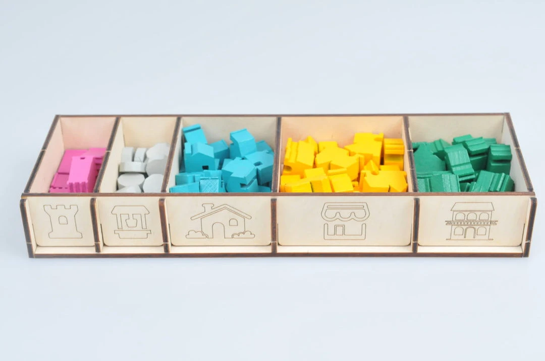 - Two trays to hold wooden house meeples.