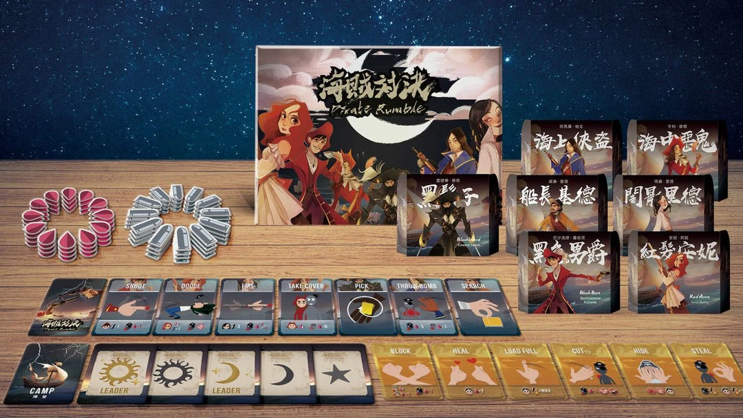 There are 6 basic cards in the deck of each pirate. You can play “Load” to collect bullets; “Shoot”, “Shoot Twice” and “Fire” to deal damage; “Dodge” to defend the damage; “Search” to find special cards which are more powerful than basic cards.