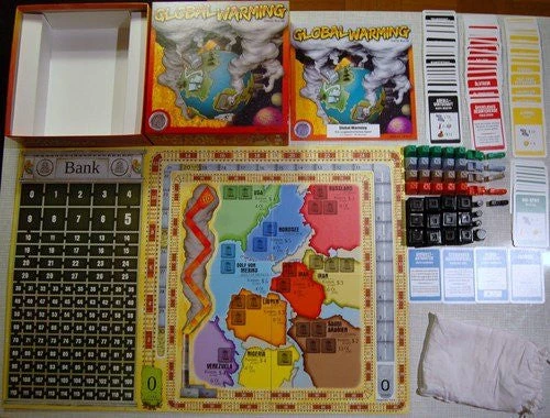 Global Warming is a tactical, card-driven game in which players score “happiness points” by providing goods to the public. Cards played can be either national industries, consumer goods, green technologies, or events; played industries require the roll of dice to determine pollution output. Collect enough happiness points and you win.