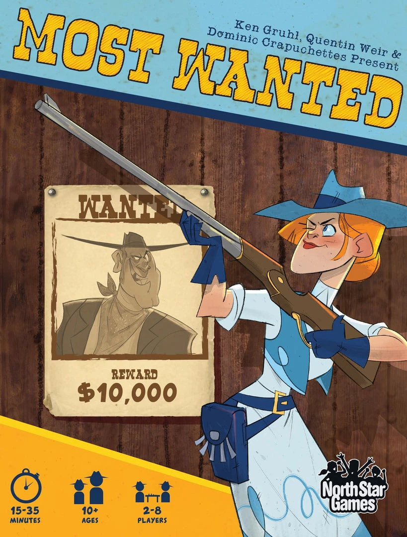 Most Wanted is a western-themed game where fellow bandits compete to become the most notorious outlaw of the land. Playing the best hand – or bluffing with the worst – could mean the difference between a successful train robbery or time spent in the slammer. Players can repent at church to make a new start, or even work some honest labor (gasp!) for bail money. Be the first player to 13 points and claim the dubious honor of being the MOST WANTED. Go get ’em, partner!