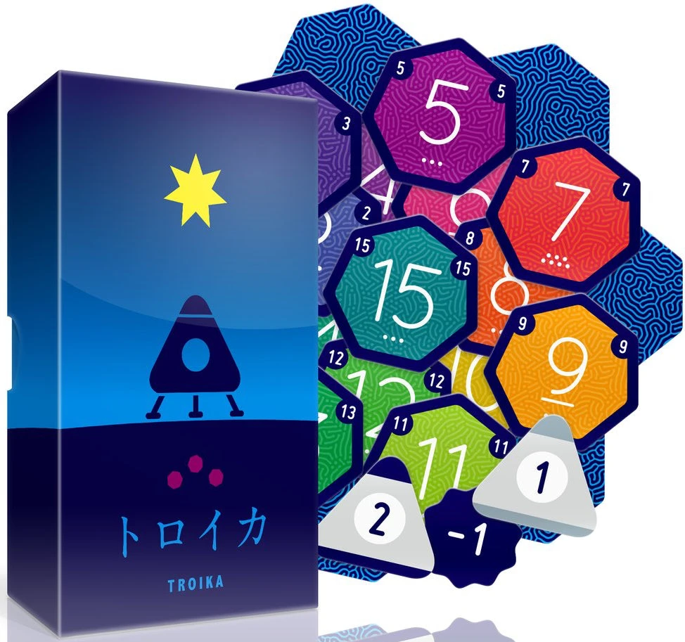 In the game, you place all the heptagonal tiles face down on the table, and on a turn you either draw a face-down tile or take a face-up tile that someone returned to the table. You have a hand limit of seven tiles, and within that limit you’re trying to collect both three tiles of the same number (to serve as fuel) and three tiles in numerical order (to transform into a gem). If you have no fuel, you can’t win the game; of those who do have fuel, the player with the most valuable jewel wins.