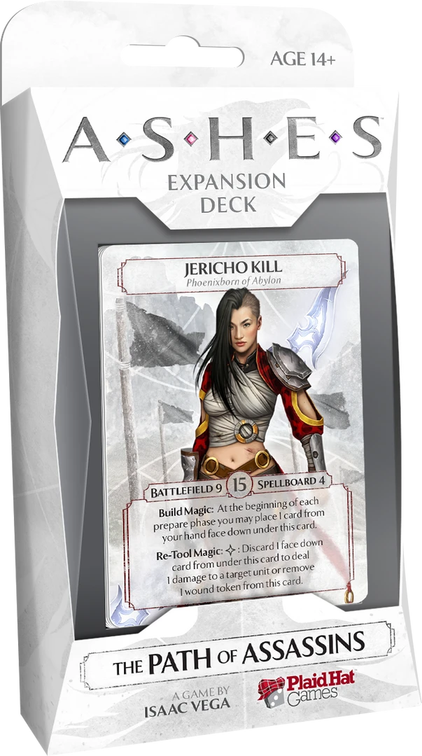Born in bonds, Jericho Kill now sits on the throne of Abylon. Trained in combat from a young age, she brings her unique skills to the Ashes universe, allowing you to experiment with new strategies and paths to victory against other Phoenixborn. Take command of powerful allies or overwhelm your opponent with magic that refreshes your exhausted dice. Every card in The Path of Assassins can be used to customize any Ashes deck, giving you the freedom to tailor the experience to your own style of play. Unlock Jericho’s full potential with The Path of Assassins!