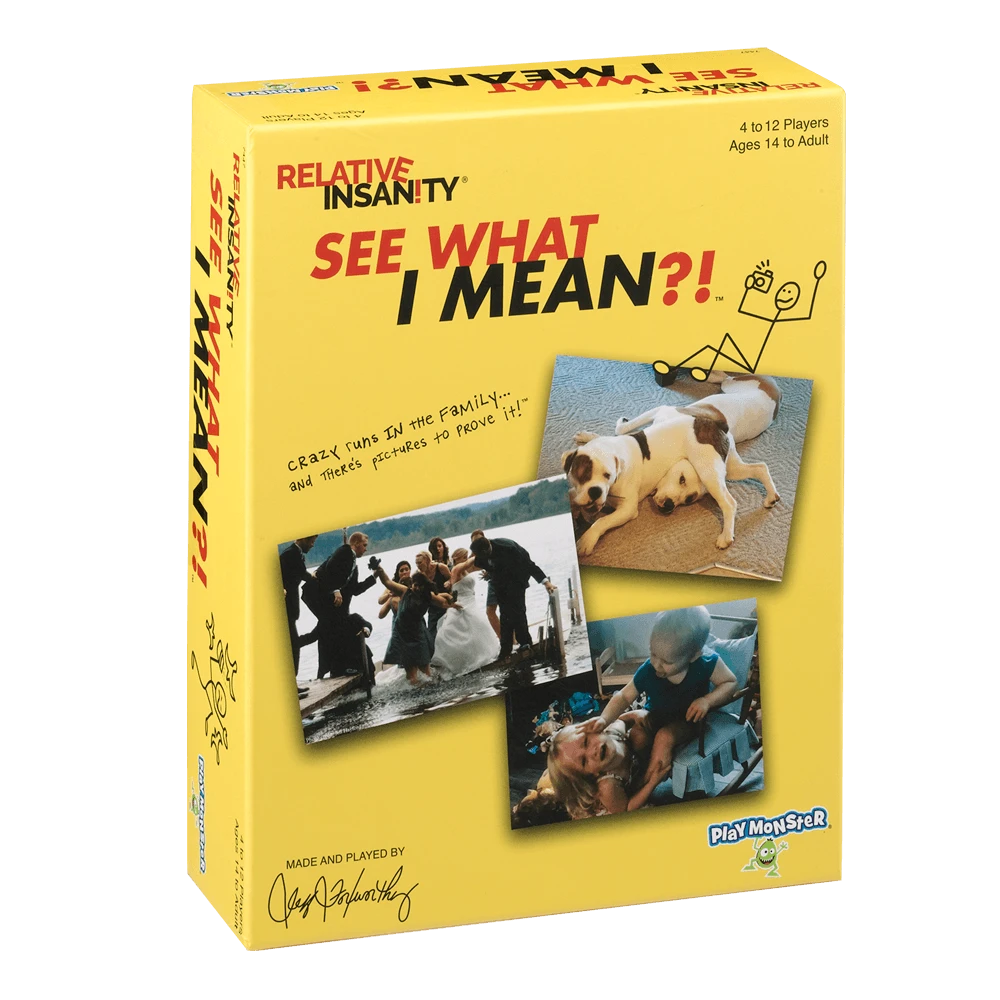 In Relative Insanity, everyone looks at a hilarious photo that could have come out of a crazy family photo album, like a young man taking a bathroom selfie while wearing a granny nightie.