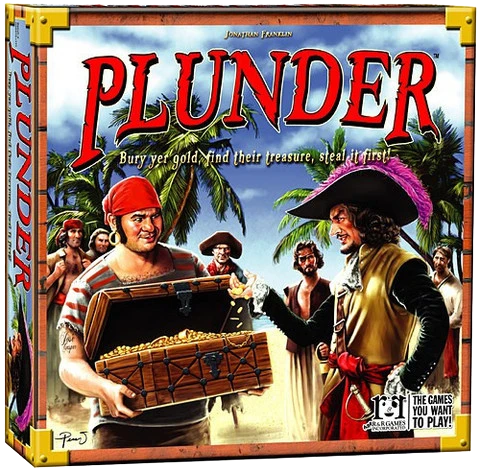 Plunder is a deduction card game in which everyone is a pirate captain with a buried treasure. Players attempt to steal the hidden treasures of the other captains by figuring out the three landmarks that mark where each treasure is hidden. The first player to a treasure takes the largest share, while those who reach it second or third receive less. Keeping your treasure from being stolen is also worth victory points in the end. Find and steal the most treasures first to win in the end!