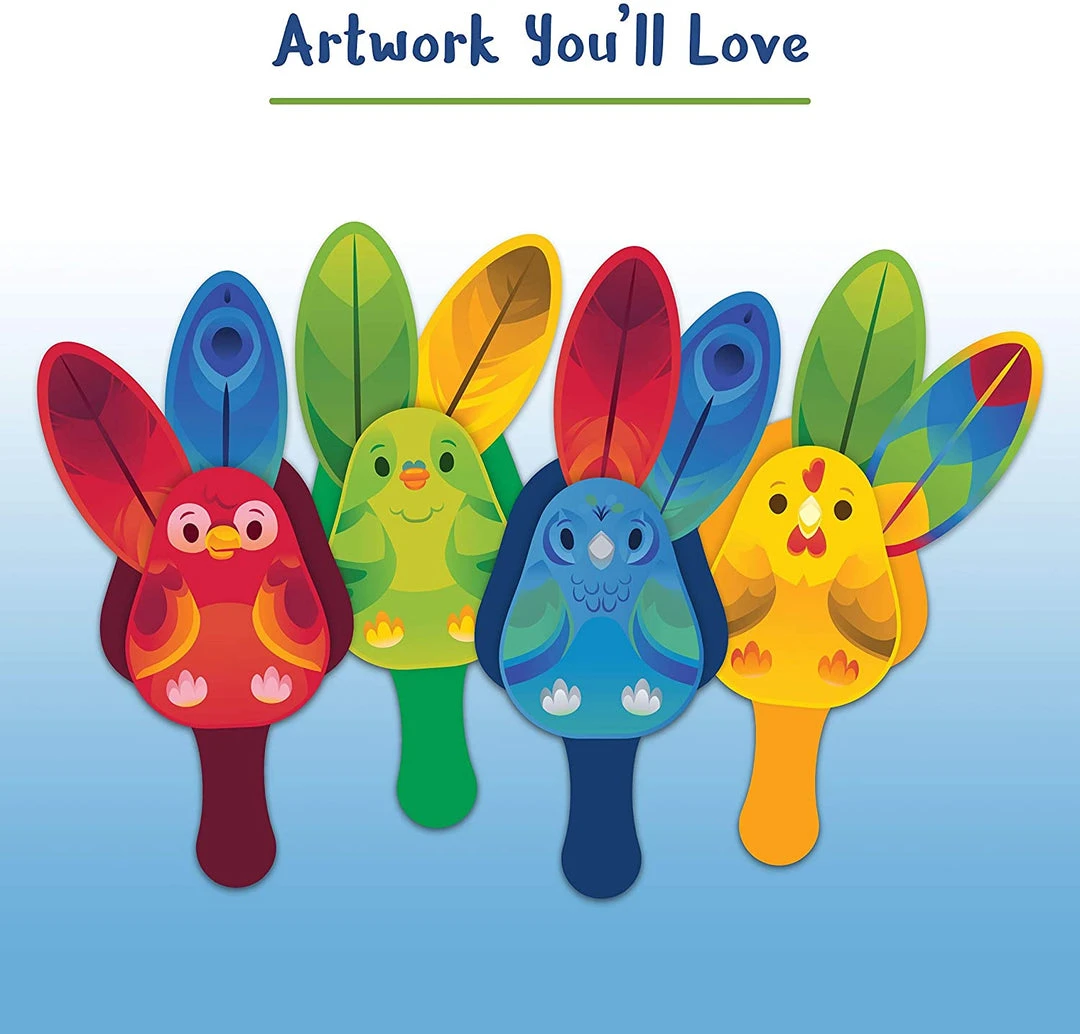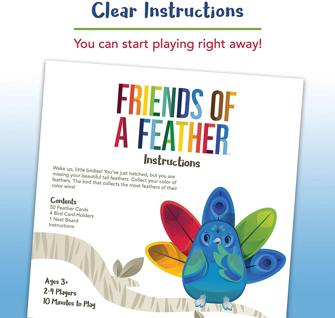 Four little birds are missing their tail feathers, and need your help to find them! Add feathers to your bird each turn by drawing from the deck, or trading away your unwanted feathers to the nest. Score points at the end of the game based on your colorful collection. The player with the most points wins!