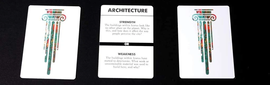 Icarus is a collaborative storytelling game about the collapse of a great civilization. Every game begins in a city – nation known as Icarus at the height of its power where, in celebration, the city has decided to erect a massive, ever – growing monument in the center of town to display its prestige to the world. During the game, you will be stacking dice to represent the construction of this monument, drawing cards from a story deck to create the escalating events in the city, and influencing the outcome of those events through actions driven by your characters motives. And when the dice tower finally falls, your civilization falls with it and the game comes to an end.