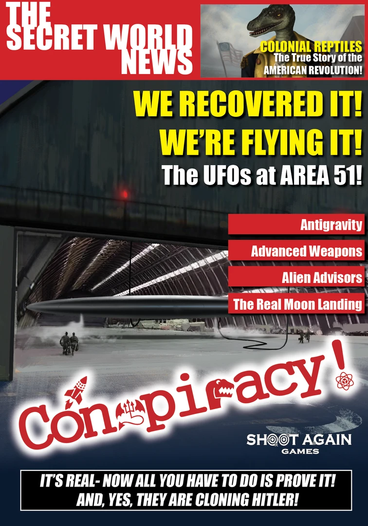 Conspiracy! is a game for two to four players. During the game players reveal conspiracies, each of which grant the player some special power. Additionally, players can work to discredit the insane conspiracies of other players (what nut jobs!) by leaking stories to the tabloid press. Points are scored for the conspiracies left at the end of the round and those that are accepted possibly true by the public double in value.