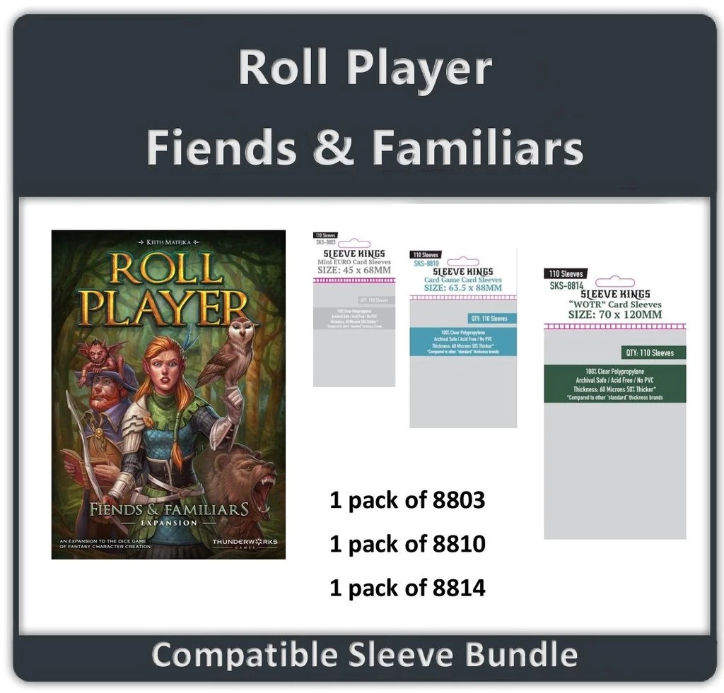 These are all the sleeves you need to sleeve everything for the game Roll Player: Fiends & Familiars Expansion. This bundle includes: