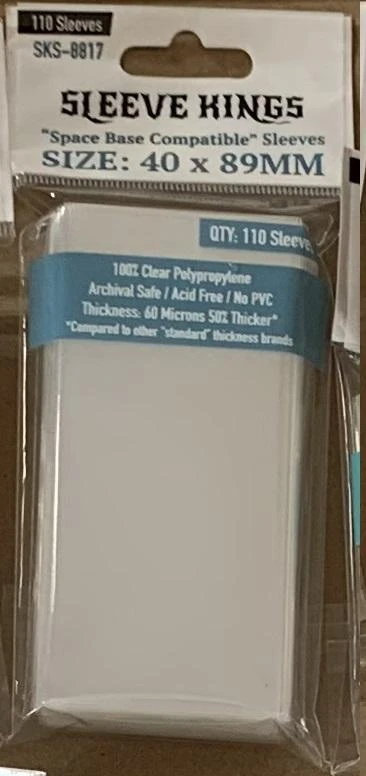 Note that Sleeve Kings sized these for 40×89 cards rather than 39×89 so they could also accommodate Coin & Crown, another popular game that is just 1 MM wider than Space Base cards, but both of these games’ cards will be well protected in these sleeves!