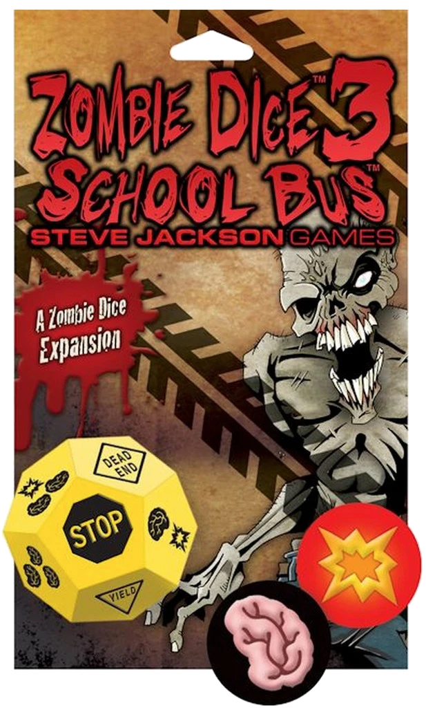 Zombie Dice 3: School Bus, an expansion for Zombie Dice, adds a 12-sided die to the game that’s rich with tasty teenage brains, jam-packed with nutritiousness from all their time at school — but those kids are packing shotguns, too, so you might find yourself chowing down on a brain bullet, chasing runners off the bus, getting run over the bus(!), or finding yourself on the receiving end of multiple shotguns.