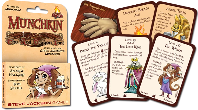 Munchkin: The Red Dragon Inn brings the characters from SlugFest Games’ The Red Dragon Inn series of games to the world of Munchkin. This mini-expansion of 29 cards features Monsters, Treasure, and new Drinks to consume — a variation on one-shots — as well as a special Munchkin-sized promo Prize card for The Red Dragon Inn.