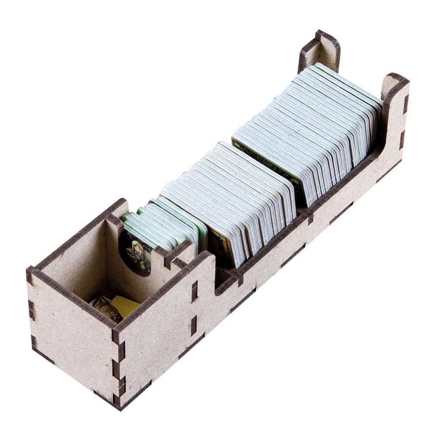 Designed to fit into the game box. Designed for both sleeved and unsleeved cards.