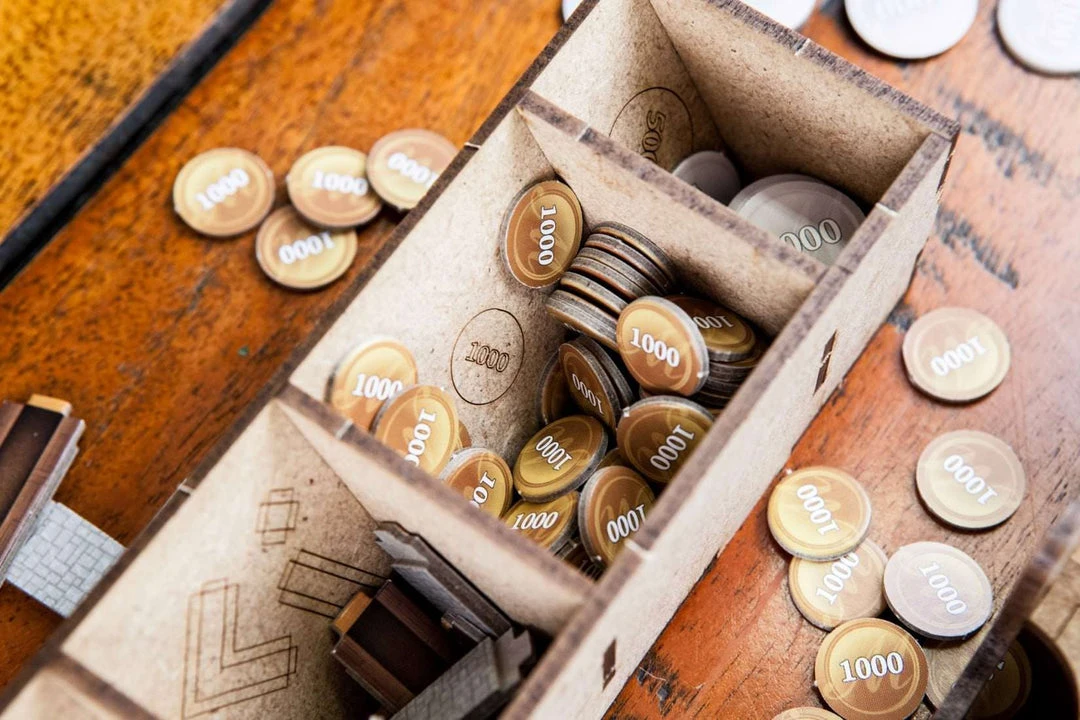• 1x easy pick box with spaces for swans (expansion) tokens, 1000 value coins, 5000 value coins and secret passages (expansion).