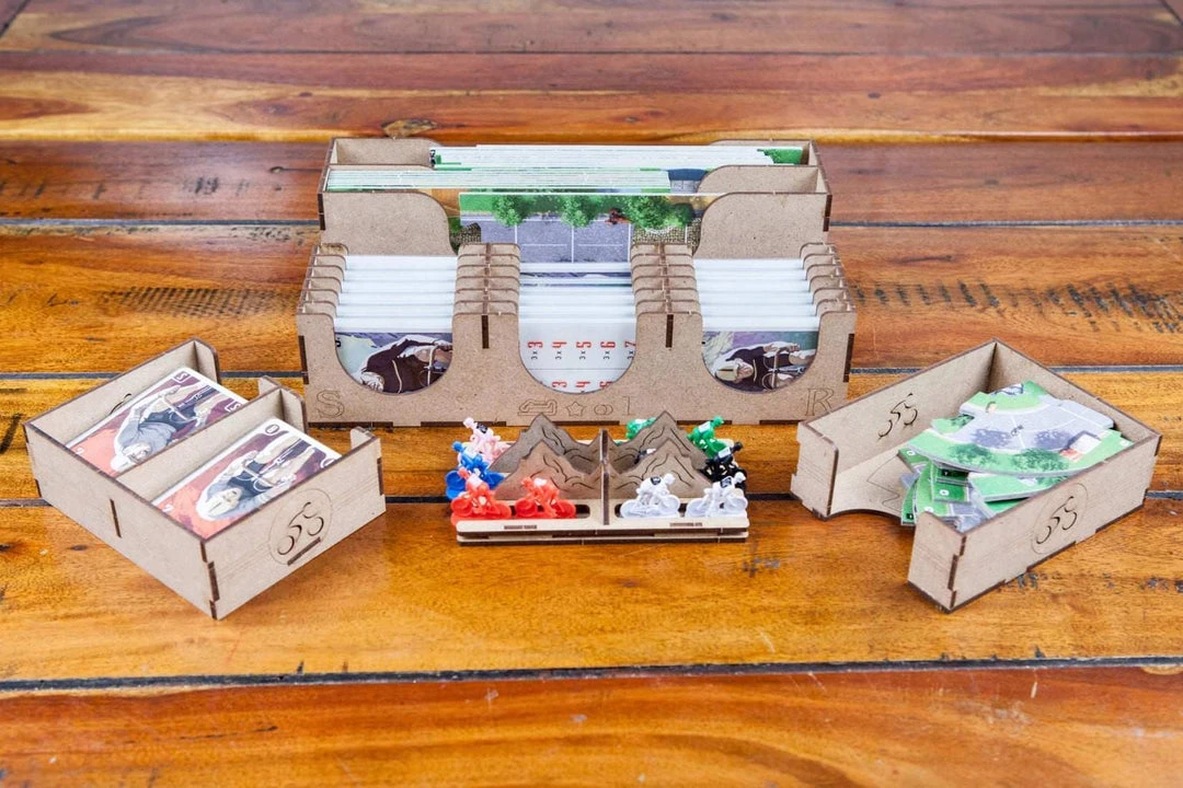 Organizer compatible with Flamme Rouge (base game or with Peloton expansion). This organizer is suitable alternatively for just the base game or base game + expansion. There is additional space for Meteo expansion, in this case the lid could sit some mm higher.