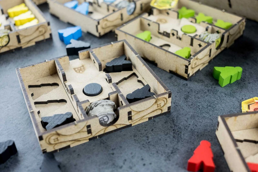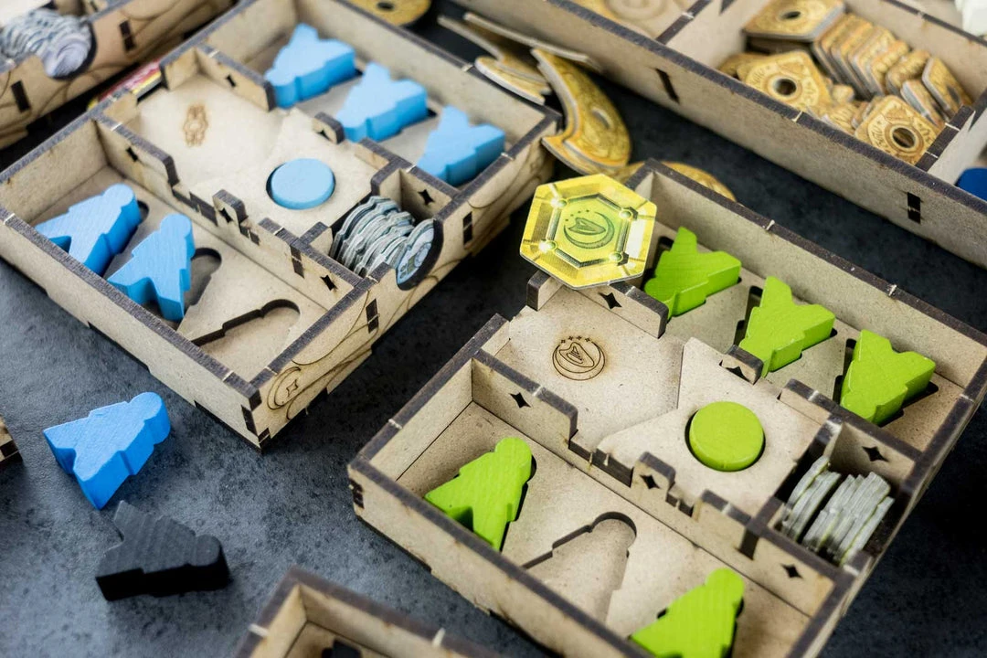 • 1x resource tray with slots for each type of resources and 5x tokens. Central slot for neutral meeples.