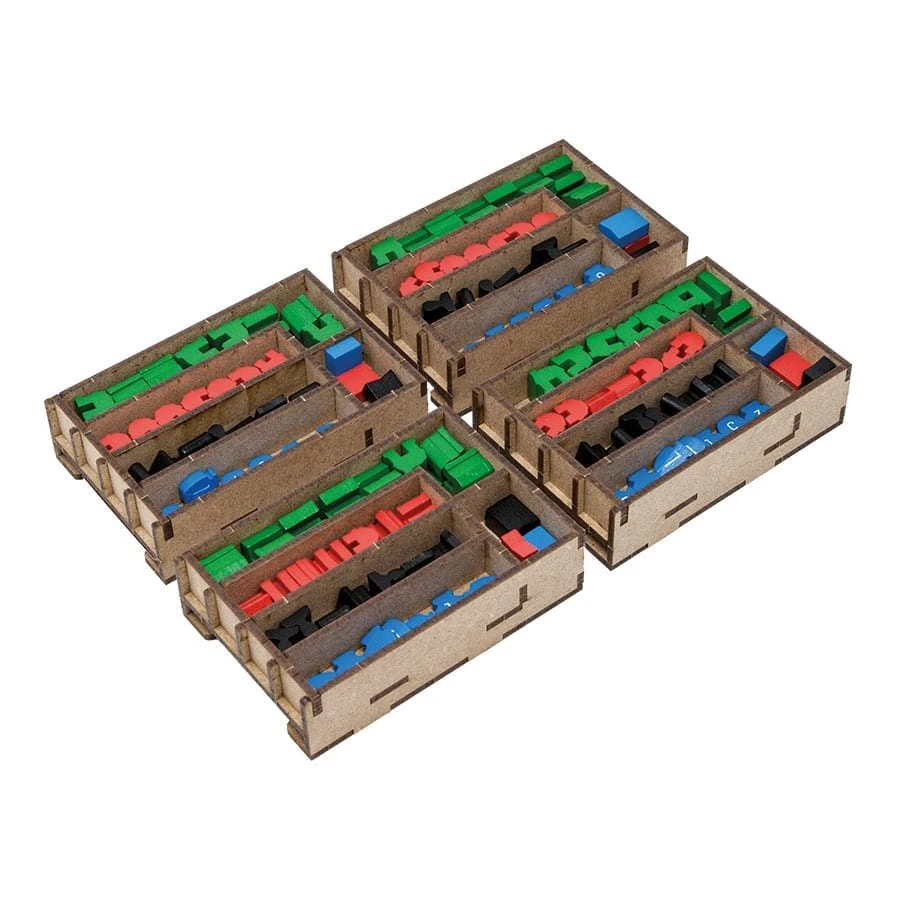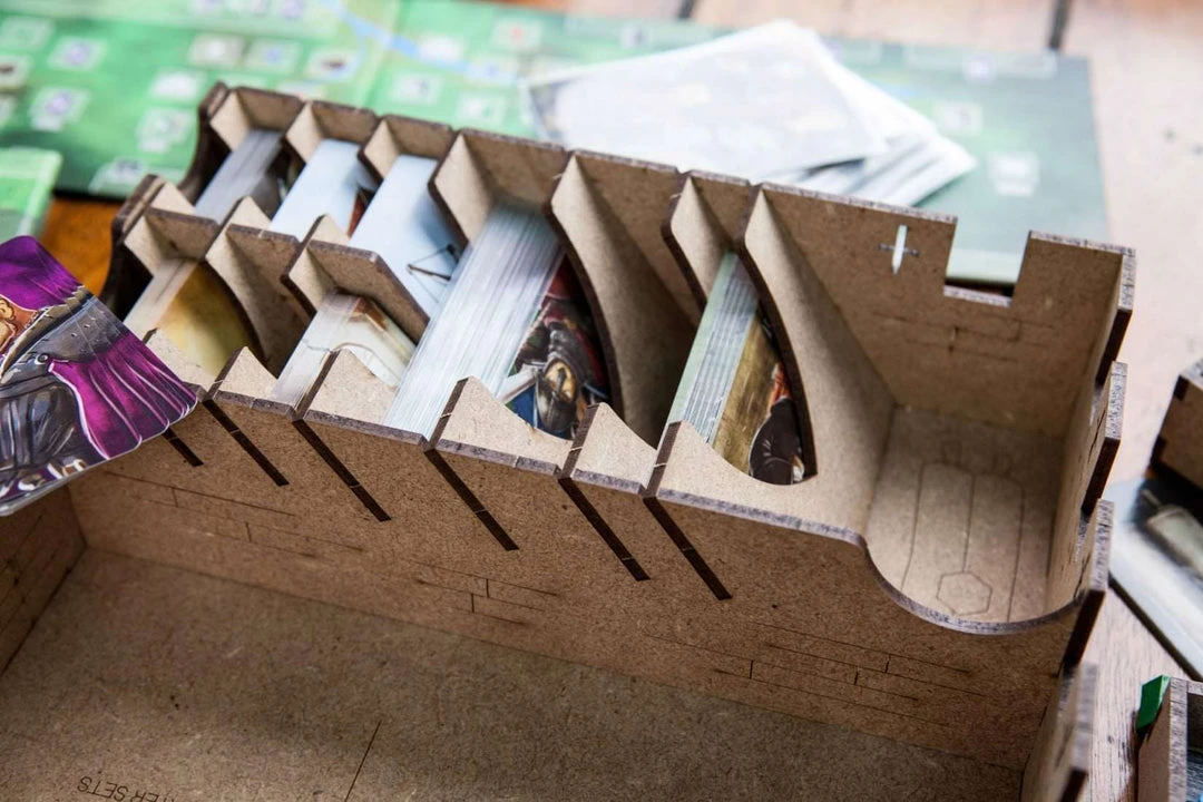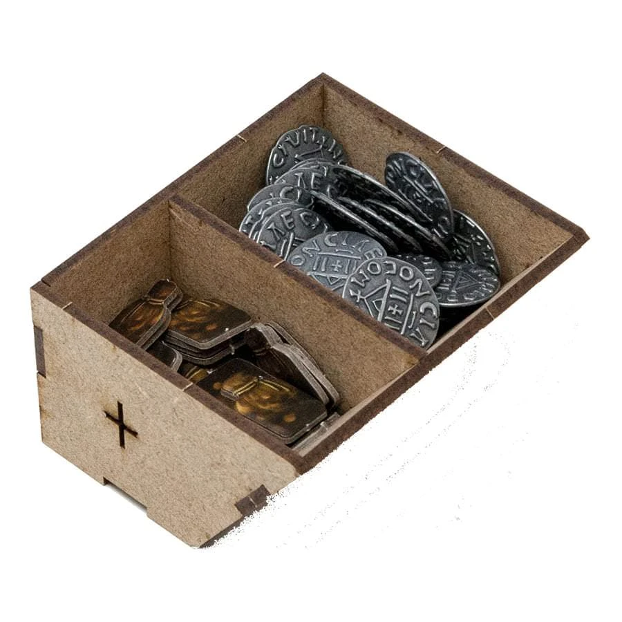 Organizer compatible with Paladins of the West Kingdom. Includes slots for kickstarter exclusives (promo cards and metal coins).