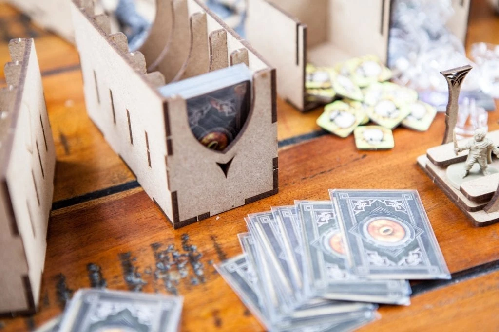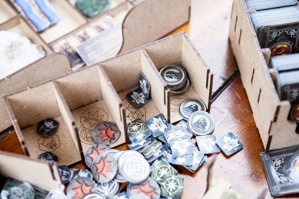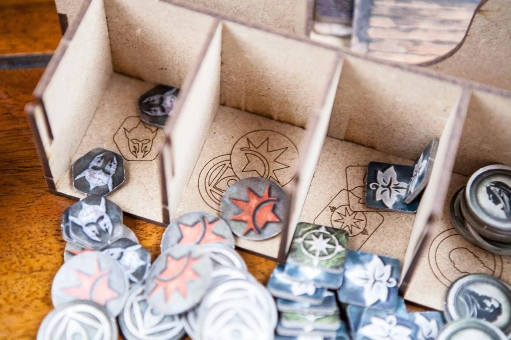 • 1x “ready to play” token holder with spaces for search components, darkness, exploration and Npc;