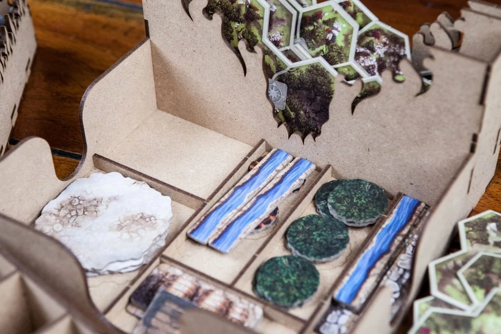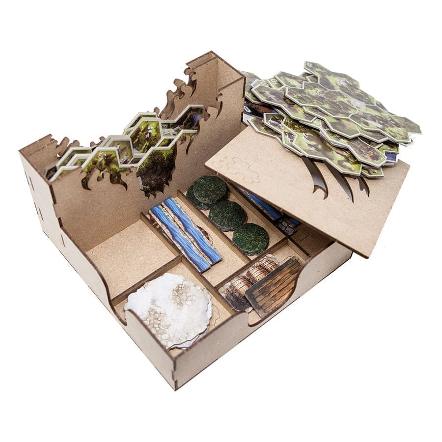 • 1x map setup box with hostings for big and small tiles, character sheets, battle setup map tokens and extra space for tokens and tiles from future expansions. Double bottom for travel/battle map differential setup.