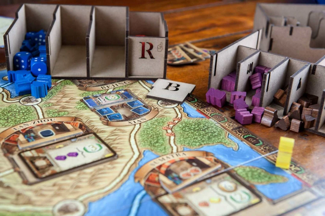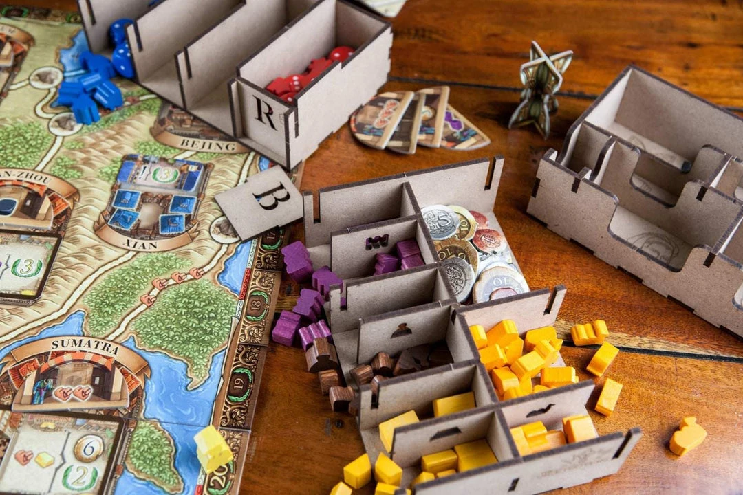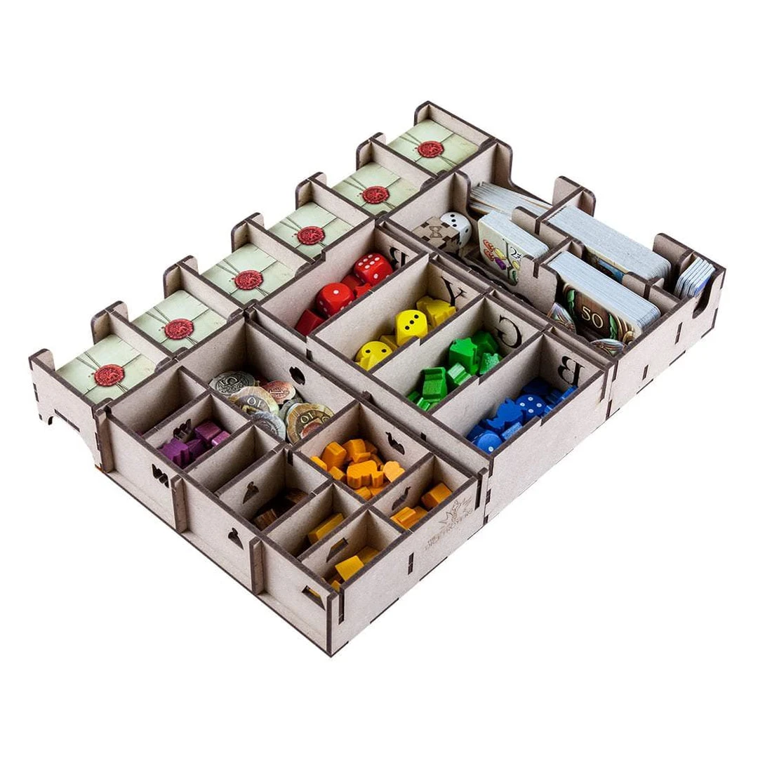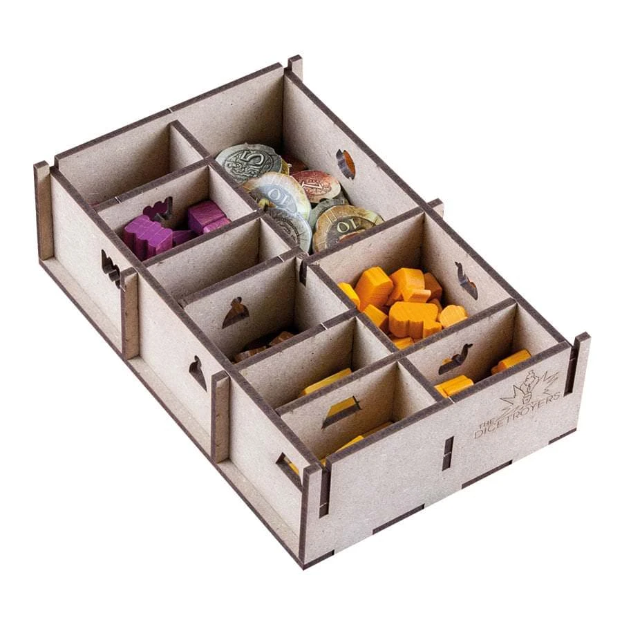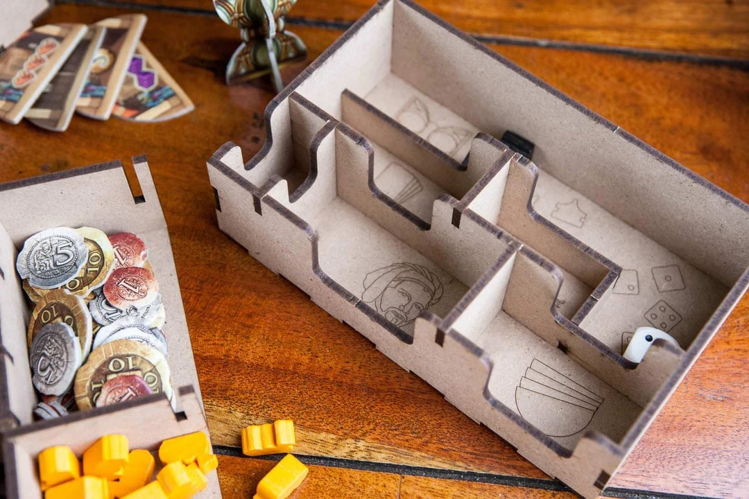 • 1x resource and coin holder, with 9 slots to keep each resource and 1x and 3x meeples separate, shutter opening for easy access to the pieces.