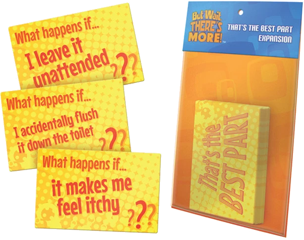 Are you such an expert pitchman that you can sell ice (that attracts beautiful butterflies all summer long) to Eskimos? Then the But Wait, There’s More!: That’s The Best Part! expansion for you! Every good pitchman lets his audience ask questions, and that’s precisely what this expansion adds!