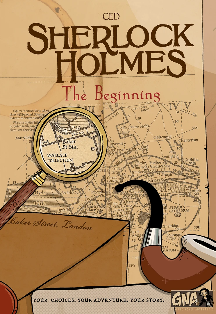 Sherlock Holmes is a comic combined with a game, one title in a series subtitled “The comic in which you are the hero”. You embody a character in a immersive story in which your choices guide your progress. You have a character sheet akin to those used in role-playing games that tracks your possessions, your special abilities, your coins, and your victory points. In general, gameplay consists in following the comic’s panels — which contain clues, riddles and traps — and making choices about where to go and what to do, while using your visual perception to collect clues and be smart enough to resolve the riddles. As in any game, you can lose — sometimes really badly!