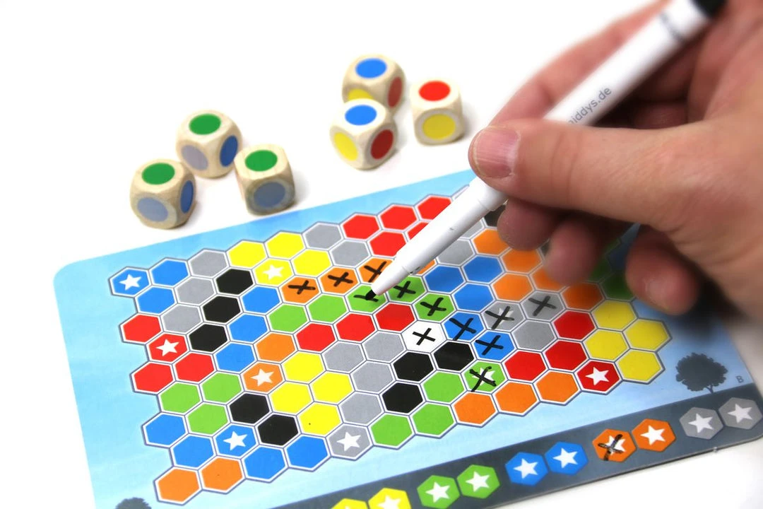 Dobbelland, a.k.a. Diceland, is a racing dice game in which nothing has to be calculated. Every plays each turn based on the same roll of the dice, with all players racing to be the first to reach nine treasure fields and complete a territory of one chosen color. The game includes four double-sided wipeable playing boards for variety.